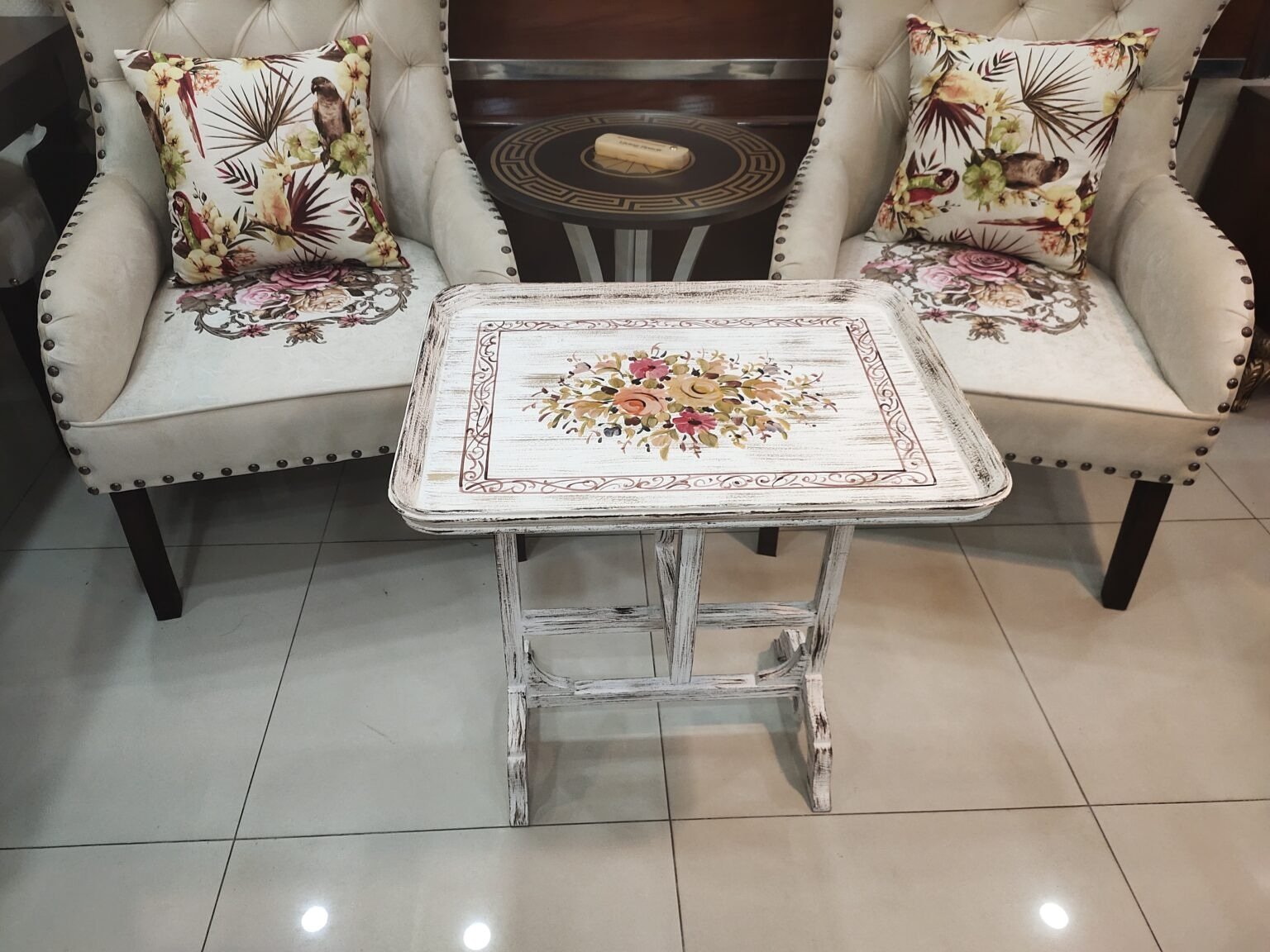 A beautifully crafted hand-painted foldable tray table made from solid Kikar wood for lasting durability. Finished in elegant Deco paint with delicate floral artwork, it adds charm to any space. Its foldable, multi-purpose design makes it perfect for serving, tea time, or everyday use.