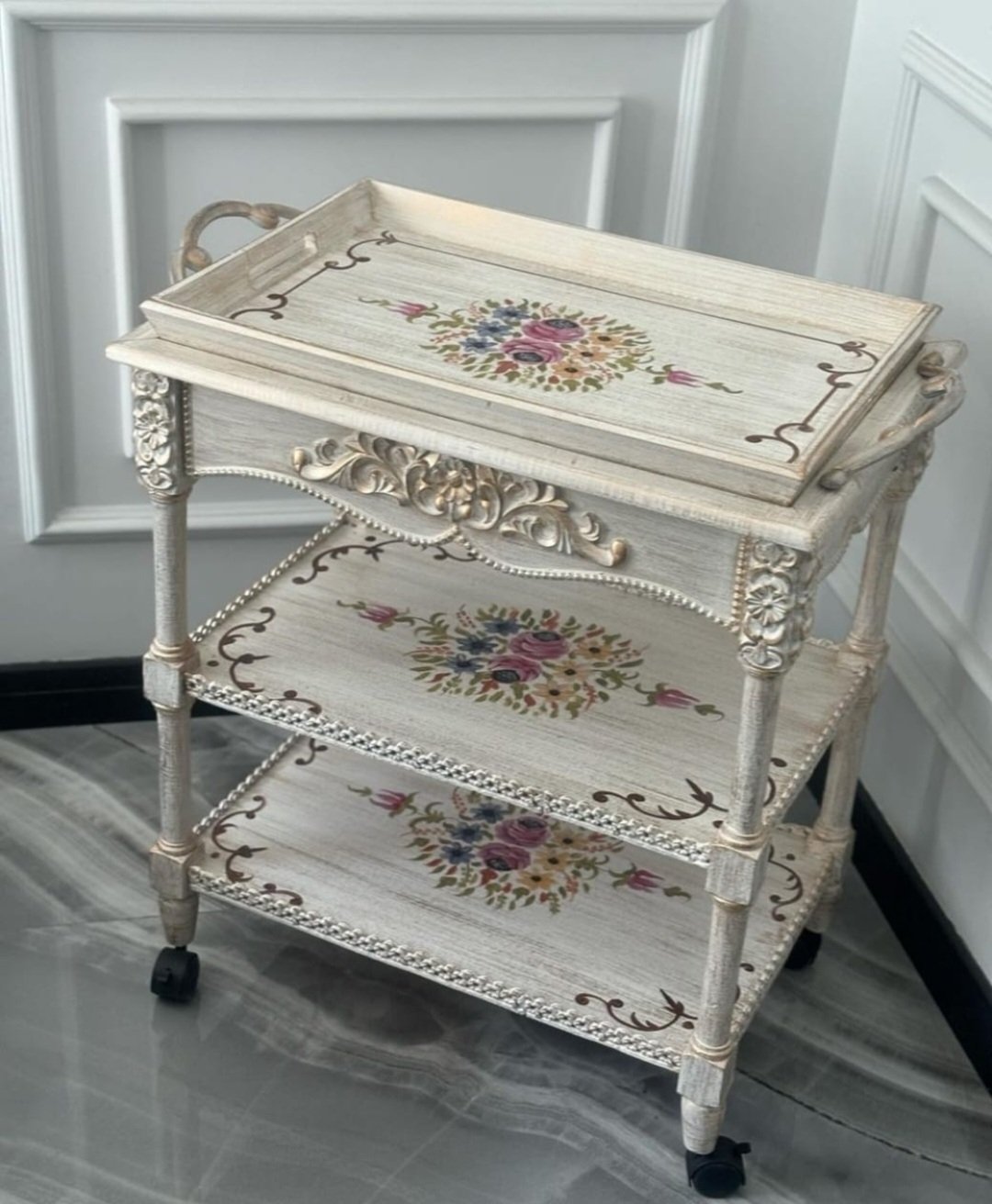 White Antique Hand-Painted Tea Trolley With Metal Handles